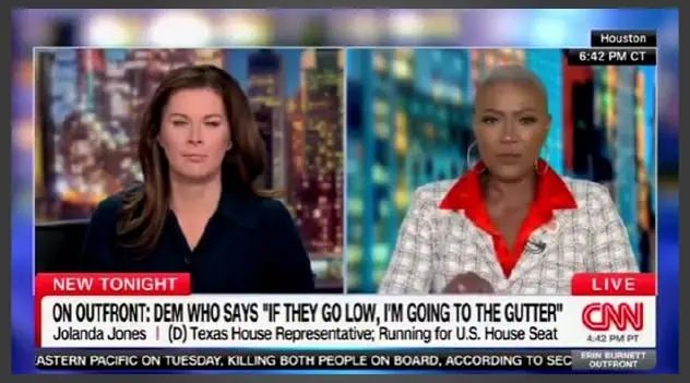 In an absolutely jaw-dropping and bonkers CNN interview on Wednesday, October 22, Texas Democrat Jolanda Jones explicitly rejected the famous “when they go low, we go high” mantra of former first lady Michelle Obama, saying instead that she wants to “wipe out” Republicans and will fight vigorously against her foes by going “across your neck.”