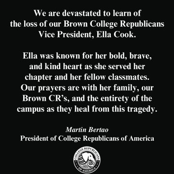 "We are devastated to learn of the loss of our Brown College Republicans Vice President, Ella Cook," the club's president, Martin Bertao, stated. "Ella was known for her bold, brave, and kind heart as she served her chapter and her fellow classmates. Our prayers are with her family, our Brown CR's, and the entirety of the campus as they heal from this tragedy."