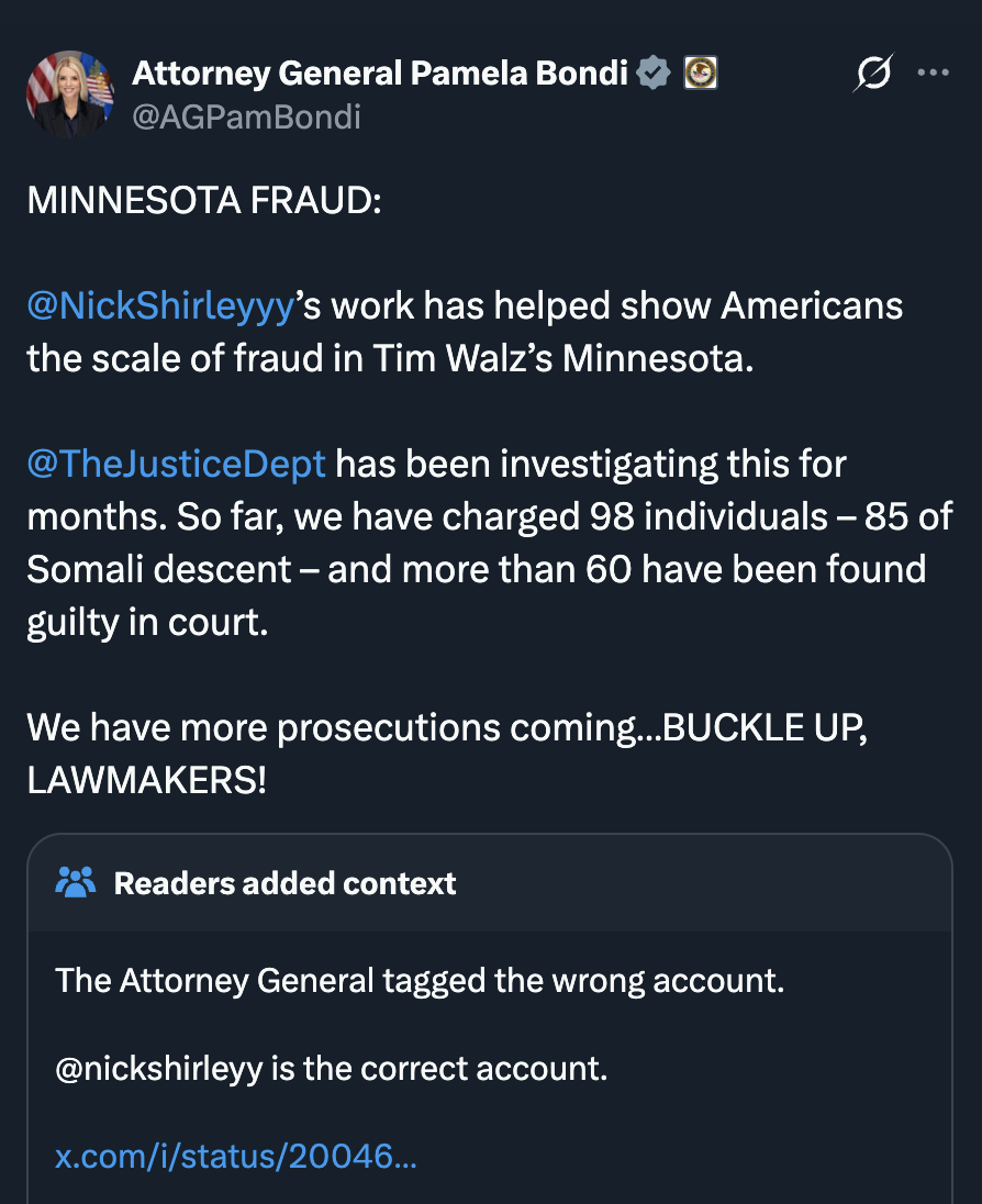More details about potential migrant fraud is being uploaded to YouFundThis.com as well as SomaliScan. U.S. Attorney General Pam Bondi, seemingly addressing allegations that she isn't arresting anyone, tried to get ahead of the backlash with this post: