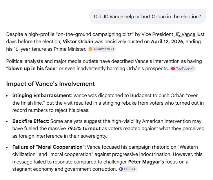 I’m pretty sure Vance doesn’t speak Hungarian, a language that is impenetrable for most English-speakers, so I don’t see how his intervention in the campaign could have been effective.