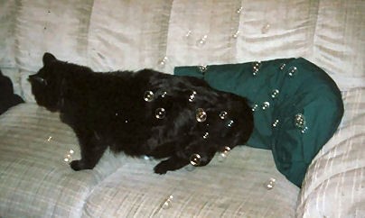Balloons are too dangerous for humans here, but bubbles do the trick in keeping cats confused.