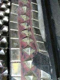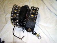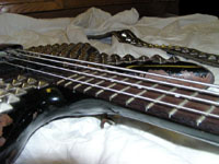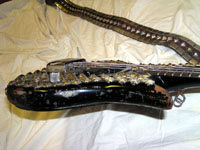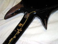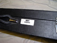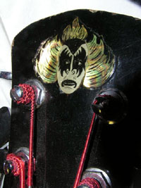 ADDITIONALLY, THIS BASS WAS SHOWN WITH GENE IN ALMOST EVERY FAMOUS PIC OR POSTER OF GENE LIVE - USED FOR GREATER PORTION OF HIS CAREER (THIS BASS WAS USED BY GENE FOR APPROX 20 YRS). ORIGINALLY PAINTED BLACK WITH WHITE SIDES, GENE RE-PAINTED IT ALL BLACK AND ADDED THE STUDS IN THE NINETIES. THIS WAS THE 1ST SPECTOR BASS EVER CREATED (COLLECTIBLE ON ITS OWN.) VIDEO EXISTS OF GENE WITH THE BASS IN AN INTERVIEW DISCUSSING THIS CUSTOM HAND-CARVED BASS. WE ARE INCLUDING TWO STRAPS WITH THIS AUCTION - THE ORIGINAL THAT ACCOMPANIED THE GUITAR FROM THE BUTTERFIELD'S AUCTION & ALSO AN ORIGINAL STRAP USED THROUGHOUT THE LOVE GUN TOUR, THE CREATURES OF THE NIGHT TOUR, THE DYANASTY TOUR, AND THE UNMASKED TOUR (Strap still shows traces of fake blood from stage show -- see photo).