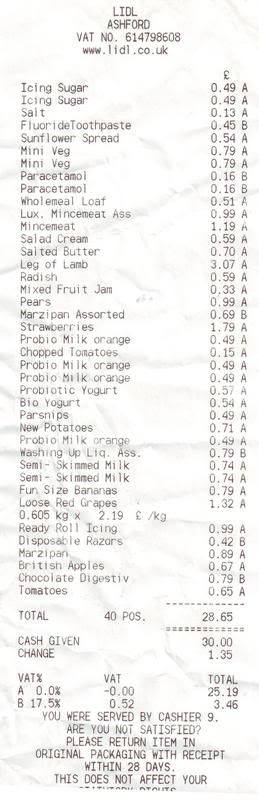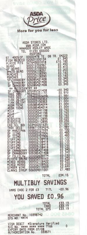 These 3 till receipts I do not think reflect my personality except that it does indicate that I have a sweet tooth and like making cakes and in particular shows that I have made my own Christmas cake as there is icing sugar and marzipan. Also I get my eggs from a different shop and I had enough flour so it does not reflect my liking for homemade food in particular pastry and egg based items.