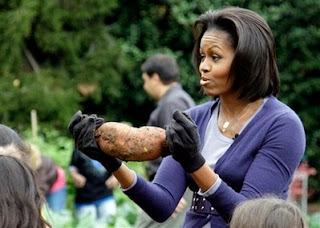 First lady Michelle Obama harvests vegetables from the garden with children from Washington's Bancroft and Kimball Elementary schools, Thursday, Oct. 29, 2009, on the South Lawn of the White House in Washington.