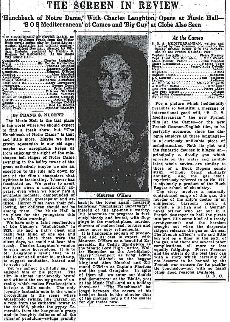 This is our last movie review for 1939, since its New York premiere was on New Year’s Eve. This “Hunchback” is a little too grim for Nugent.