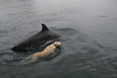 Thank God it is post season and these dudes were not at practice. Other wise they would not have been out swimming around in the ocean and seen the wayward dog.