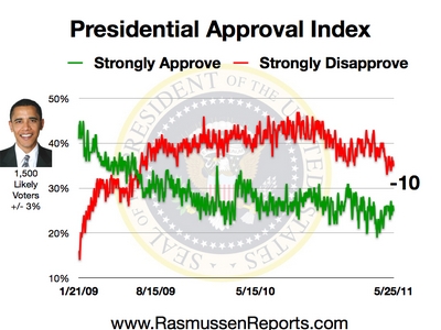 The Rasmussen Reports daily Presidential Tracking Poll for Wednesday shows that 25% of the nation's voters Strongly Approve of the way that Barack Obama is performing his role as president. Thirty-five percent (35%) Strongly Disapprove, giving Obama a Presidential Approval Index rating of -10 (see trends).
