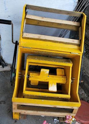 Step 3: Close outer screened hatch and slide pea collection tray below the wire-mesh cylinder. The outer screen keeps the peas from flying all over the place. Interesting