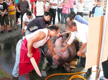 TAIPEI, Taiwan, - Animal rights advocates in Taiwan say that force-feeding pigs to make them super-large before offering them to the gods is inhumane.