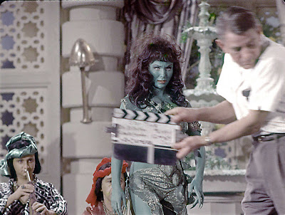 Gene's orders to Fred Phillips: "Paint her greener!" The following day the test film again showed her as pink-skinned as ever. Even Fred was dumbfounded. Recalling the incident, he says, "We did this three days in a row. We had her so green you couldn't believe it, and she kept coming back pink! Finally we figured out what was happening. The technician over at the film lab would receive the film every day and run it through the development solution. As the image formed on the film, he kept saying to himself, 'My God, this woman is green!' And so he kept correcting the film developing process in order to turn her back to normal skin color again!"