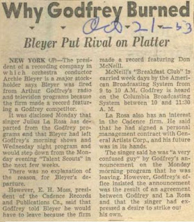 Behind the scenes, Godfrey also released Archie Bleyer, ostensibly for paying more attention to his record company to the detriment of Godfrey’s programs, but primarily because Bleyer had used part of a two-week paid vacation to record Don McNeill, Godfrey’s long-time rival from ABC. In fact, this axe fell just hours after the “swan song” broadcast. “It really hurt,” Godfrey told the press. “I said, ‘Arch, I just fired Julie and it was like tearing my eyeballs out, and I guess you’re next.” With this news, the press went berserk; you can sample just a portion of their output here.