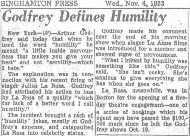 With La Rosa’s “confused guy” coupled with Rockwell’s bluster, Godfrey’s temperature rose, and he felt compelled to make a public statement… which would become his metaphoric cell phone text to the mistress. “Whenever I take anybody on my shows, it’s because I go a little crazy about a quality I see in them which, for lack of a better word, I call ‘humility.’ I don’t have any real artists on my show…. I’ve felt that, rather than a good voice, a likable, lovable personality is more important.” Godfrey then explained that, with the hiring of an outside agent, it was clear to him that La Rosa had lost this quality.