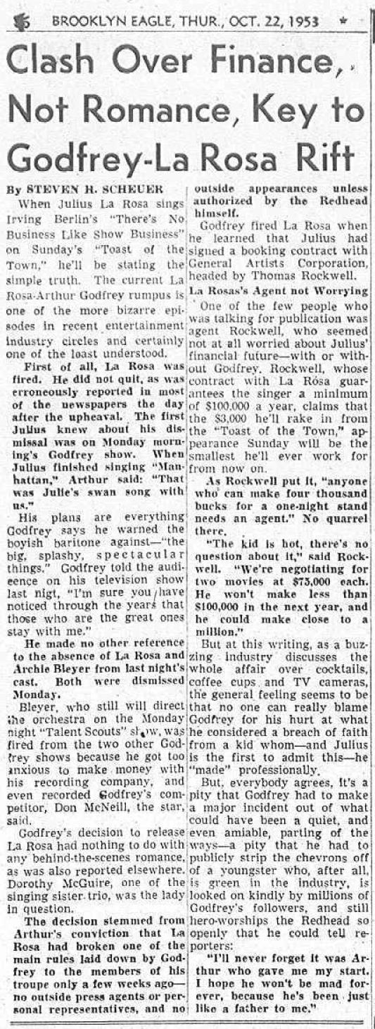Godfrey on October 4, 1950. Impressed with the young sailor’s vocal gifts, Godfrey twice had him appear on “Talent Scouts” when on shore leave, and promised him a steady job upon his discharge. The young man happily took him up on this generous offer (see related article), and on November 17, 1951, Julius La Rosa became one of “the Little Godfreys,” with steady appearances on “Arthur Godfrey Time” and “Arthur Godfrey and His Friends.” With Godfrey’s orchestra leader, Archie Bleyer, La Rosa co-formed Cadence Records and recorded a string of hits. By mid-1953, the 23-year-old crooner’s fan mail was outdistancing that of his boss.