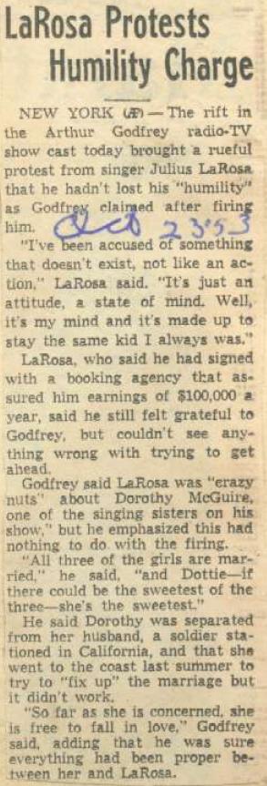Flash forward to the following Monday, October 19. La Rosa: “I get to work at the radio studio (for “Arthur Godfrey Time”). I was scheduled for the 10:15 segment, but one of the ways Godfrey would discipline you would be to keep you sitting around there, waiting to go on. It was his show – he pulled all the strings.