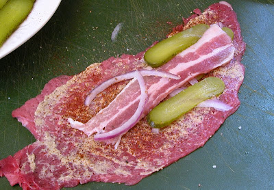 METHOD Spread each slice of beef with a little mustard; s/p. Top w/ slice bacon, thin pickle spear. Sprinkle w/ bit onion. Roll-up to form meat roll. Secure with toothpicks or string (Grandma uses cotton thread). Brown on all sides in hot oil, then place in roaster.