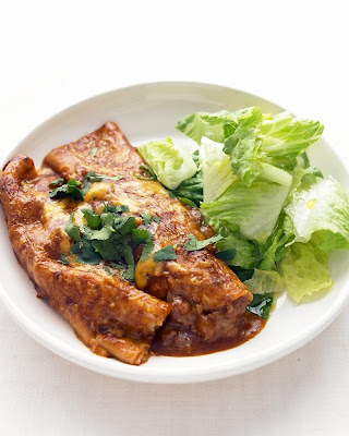 ENCHILADAS Stack 8 corn tortillas; wrap in foil, warm in oven 10 min. Fill w/ heaping 1/4 cup beef mixture, 2 tb shredded cheddar; roll tightly.