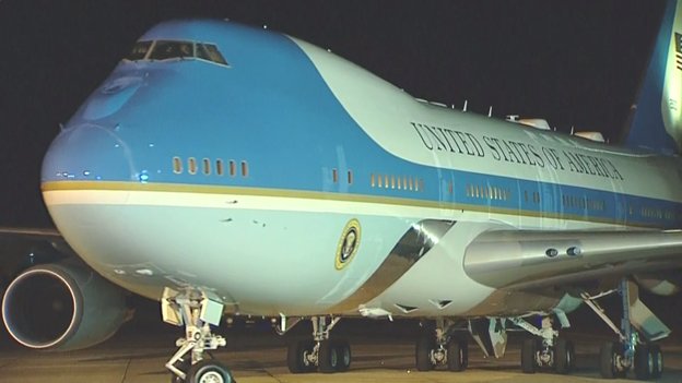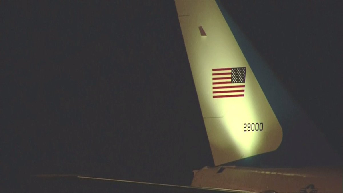 Tail number illuminated. Air Force One lands in Buenos Aires after 9 hr 11 min, 5,100-mile flight from DC.