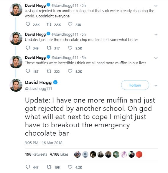 Hogg's SAT score was 1270. He got rejected by numerous small colleges. Try to tell me that shooting at his high school earlier this year wasn't the best thing to ever happen to him. Where would he be now if those seventeen students weren't dead and the shooting never occurred?