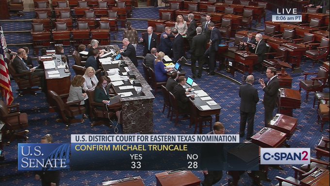 Senate NOW voting on Michael Truncale to be US District Court judge for Eastern TX. Senators advanced nomination 49-43 near party line vote Monday; Romney only R to vote No. Would be 64th district court judge and 105th federal judge approved overall by Senate in Trump presidency.