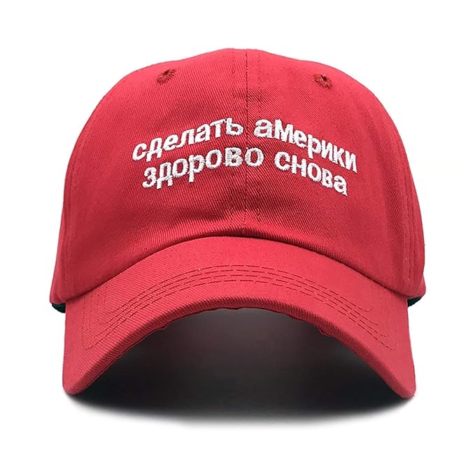 The cap says: "Сделай Америку здорово снова." That does translate to Make America Great Again, but it is an awkward use of "здорово". It should read "Сделай Америку великой снова."