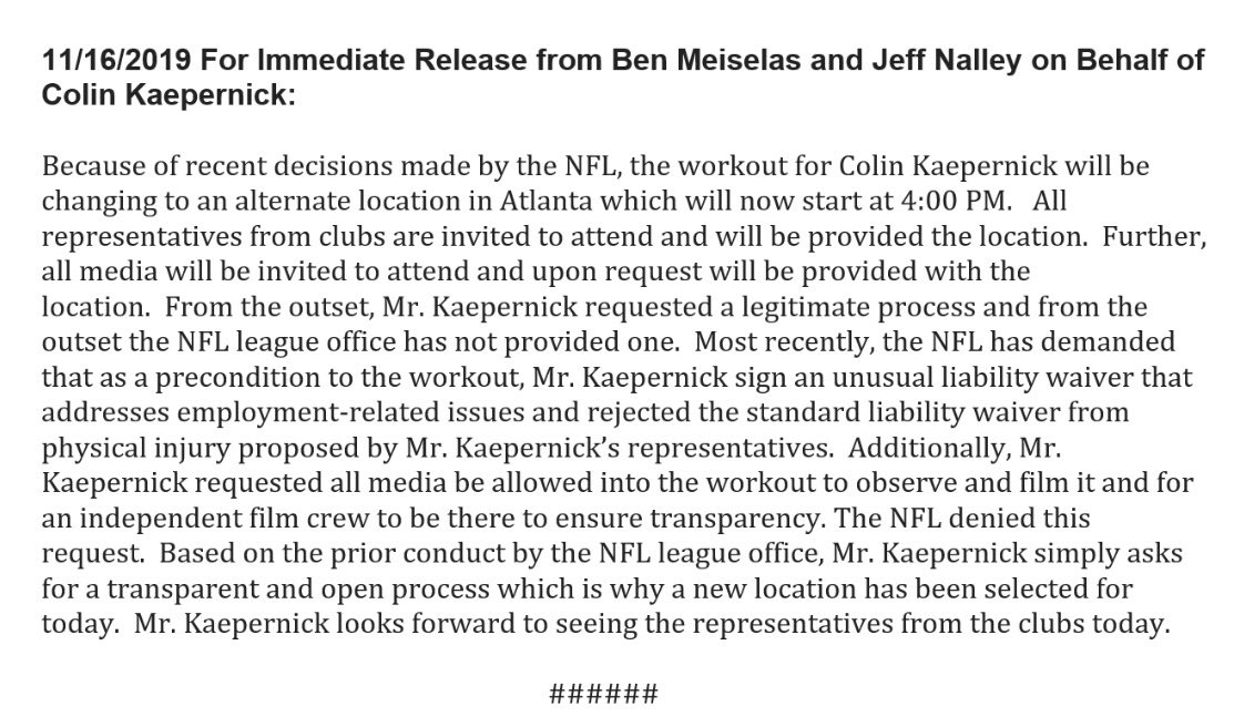 Colin Kaepernicks workout at the Falcons training facility at 3 pm is off; his workout now will be at another Atlanta location at 4 pm today.