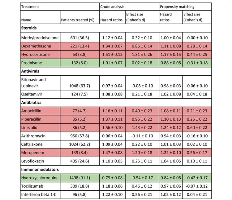The rest of the medications were found to have no measurable effect on mortality, while dexamethasone and piperacillin caused a slight increase in mortality. Three drugs, namely, hydrocortisone, linezolid and meropenem, were associated with approximately 30% increases in mortality.
