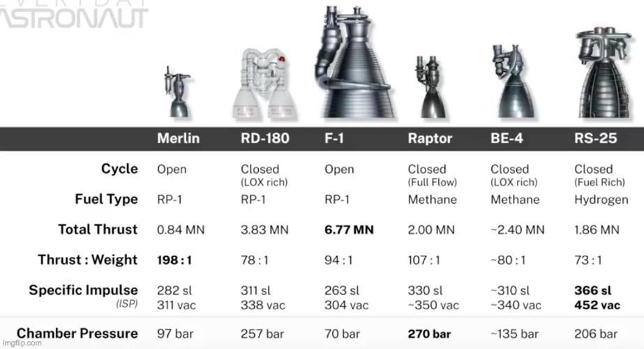 The Raptor engine compared to the Merlin engine (SpaceX Falcon9), RD180 engine (Russian), F1 engine (Saturn 5 Rocket engine that sent man to the Moon), BE4 engine (Bezos's Blue Origin) and the RS 25 (Powered the Space Shuttle and will power the SLS rocket)