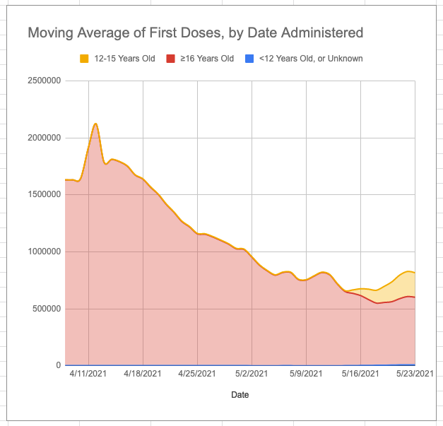 People Vaccinated, First Shot: 644,000 - ("New Normal" - just on track for the goal of 70% of adults with a first shot by July 4th).
