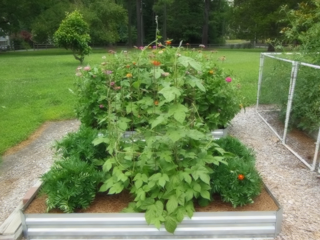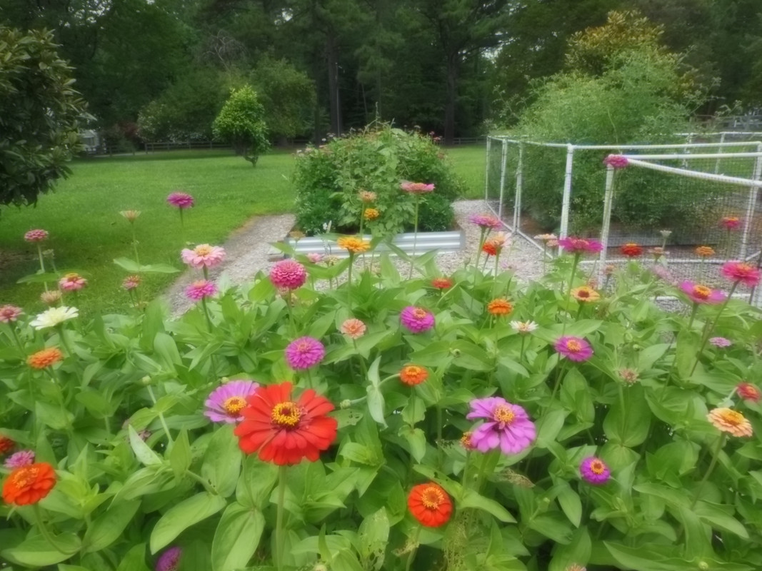 Zinnia bed in foreground, looking at bed with morning glories (climbing, not blooming yet) & marigolds. Second zinnia bed in the background.