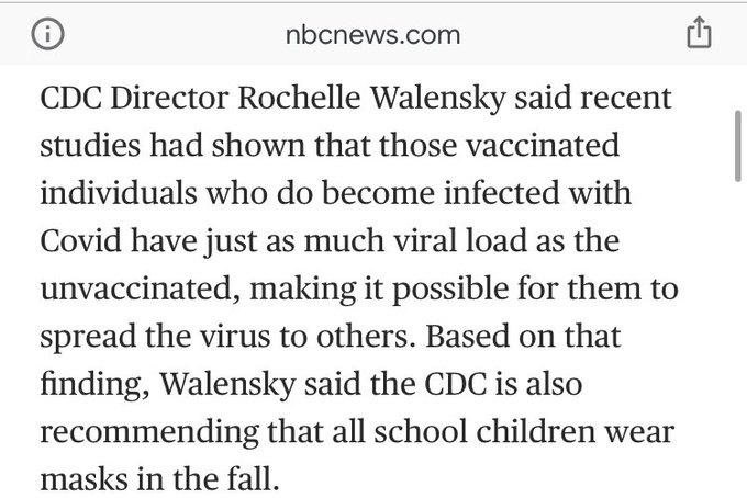 “CDC Director Rochelle Walensky said recent studies had shown that those vaccinated individuals who do become infected with Covid have just as much viral load as the unvaccinated, making it possible for them to spread the virus to others.” — NBC.
