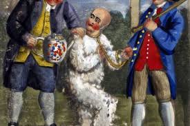 In front of wherever this pimple works we assemble a real live working guillotine. We then roll in a wooden cart with an effigy of Sellers in it. To the sound of drums we read the charges against him. Then the effigy is pulled from the cart and stuck into a stockcade and whipped. Then pulled out where it then is tarred and feathered. Finally it gets put into the guillotine and gets its head chopped off to much cheering.
