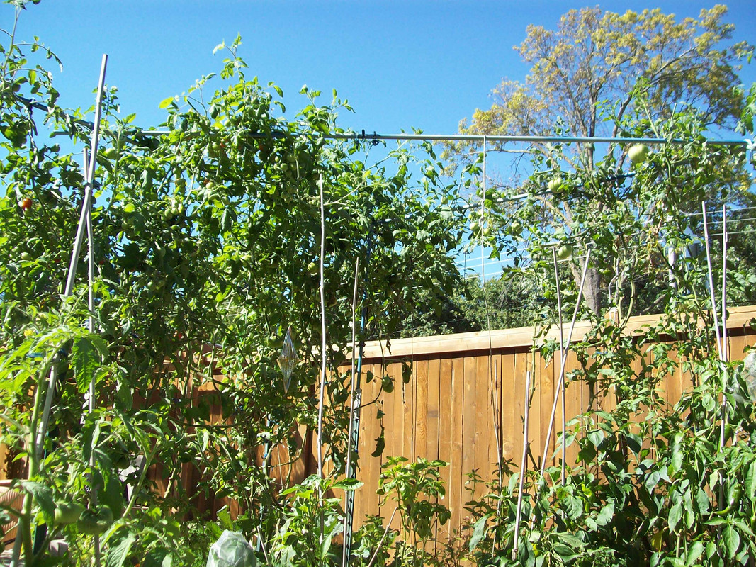 Bamboo degrades pretty quickly and gets moldy, which is not a problem with metal. Anyway. Something to consider. (Yes, its the end of the season and I am letting the Tomato vine climb all over the top! Lots of green Stupice and Trifle hanging on to those vines as of September 25!)