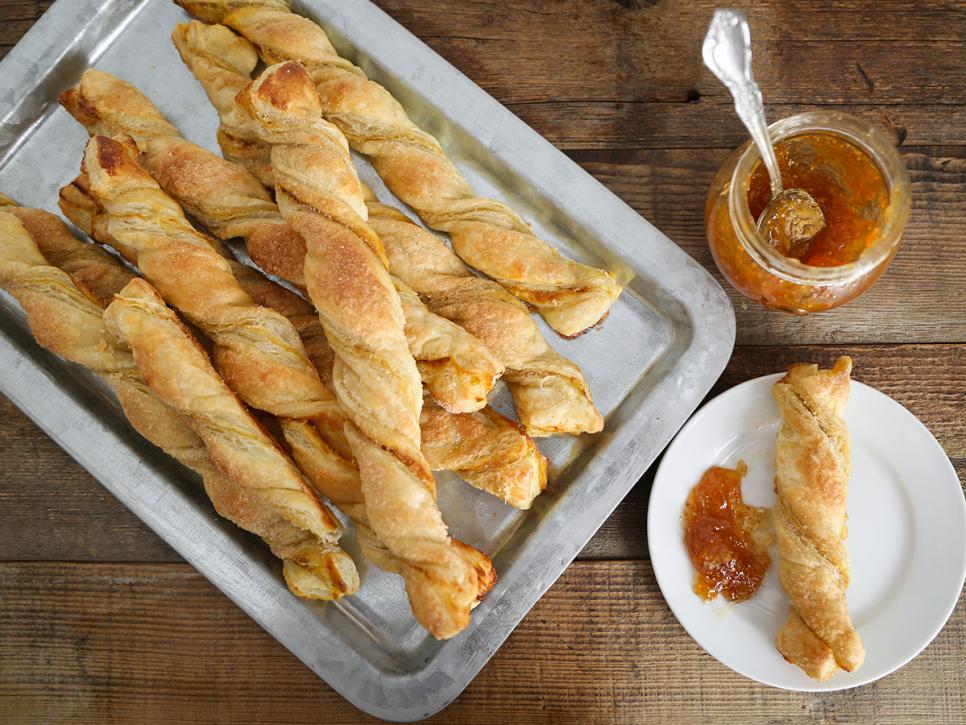 Thaw one box (2 sheets) of puff pastry and spread 2 tablespoons of pumpkin pie filling over one sheet; top with a second sheet and press together. Cut the stacked pastry into 1/2-inch thick lengths and transfer them to parchment-lined cookie sheets. Twist each piece and brush with egg wash (1 egg yolk mixed with 1 tablespoon of water). Bake at 400 degrees F for 20 minutes, or until golden brown and fragrant. Sprinkle with cinnamon sugar (optional) and serve with pumpkin or apple butter for dipping.