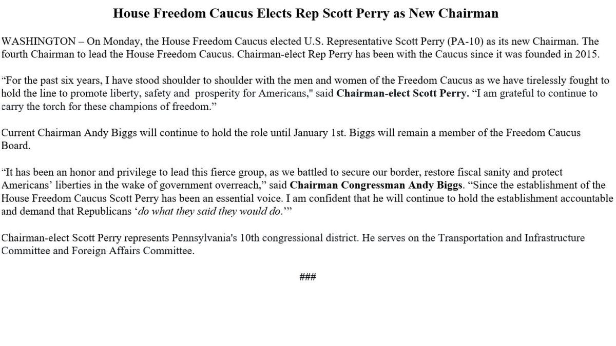 🚨🚨🚨BREAKING: House Freedom Caucus elects @RepScottPerry as HFC Chairman: pic.twitter.com/8v4rS7FHva— House Freedom Caucus (@freedomcaucus) November 16, 2021