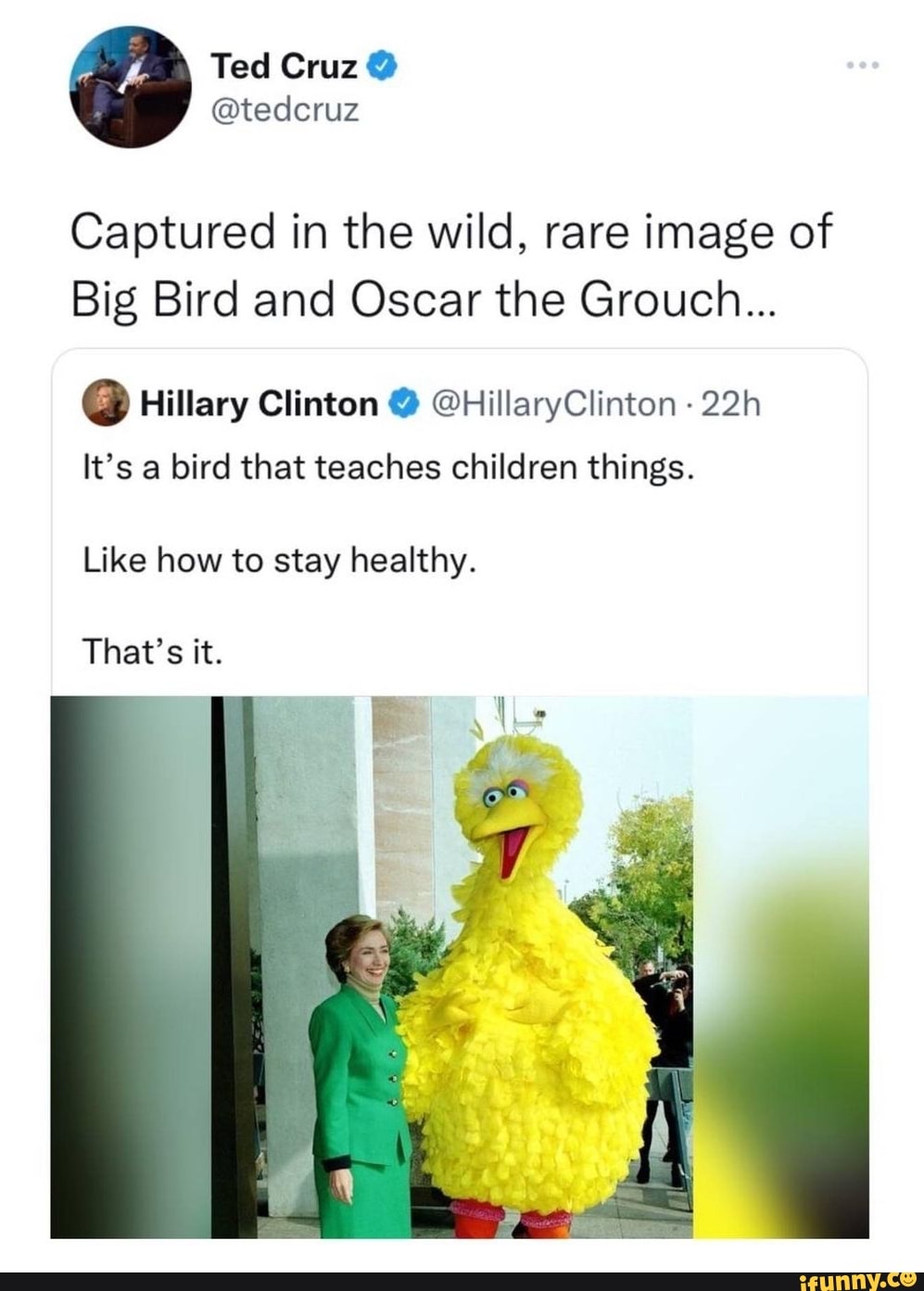 — Ted Cruz (@tedcruz) November 9, 2021 That photo showed Clinton, an unpopular figure among conservatives, wearing all green. The Sesame Street character Cruz referenced has green fur and lives in trash can. Big Bird, as always, wore yellow feathers in the picture.