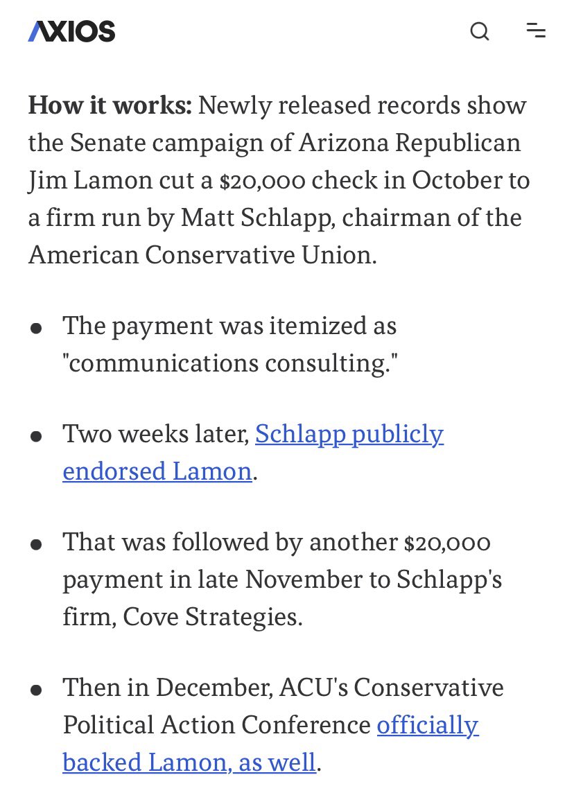 Matt Schlapp is a schmuck! He didn’t invite President Trump to the Conservative outfit’s meeting that he’s the head of and I watched him and Mercedes sit for an interview and the schmuck saying Biden was his President and he hopes he’s successful. I could swear I was his nose turn brown.