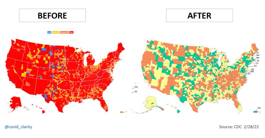 With this single change, the pandemic abruptly eased going from 90% of the United States in High-Risk Red to less than 30%. pic.twitter.com/iwhlxYMPPZ— Clarity (@covid_clarity) February 28, 2022