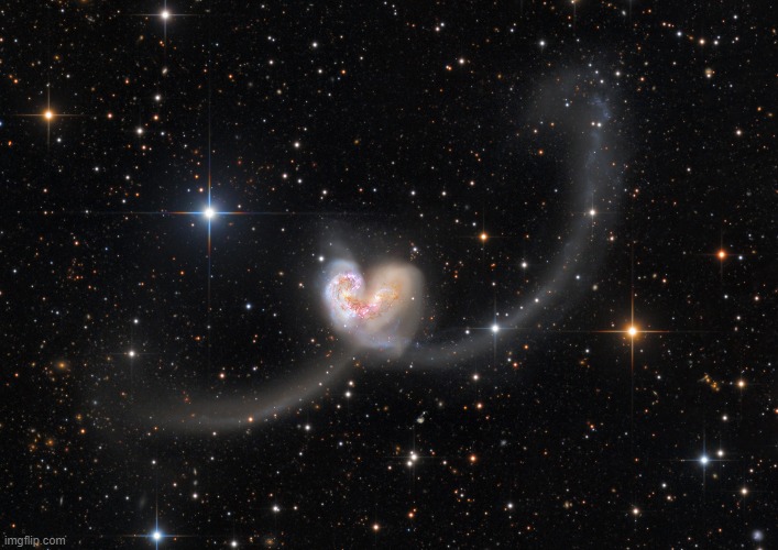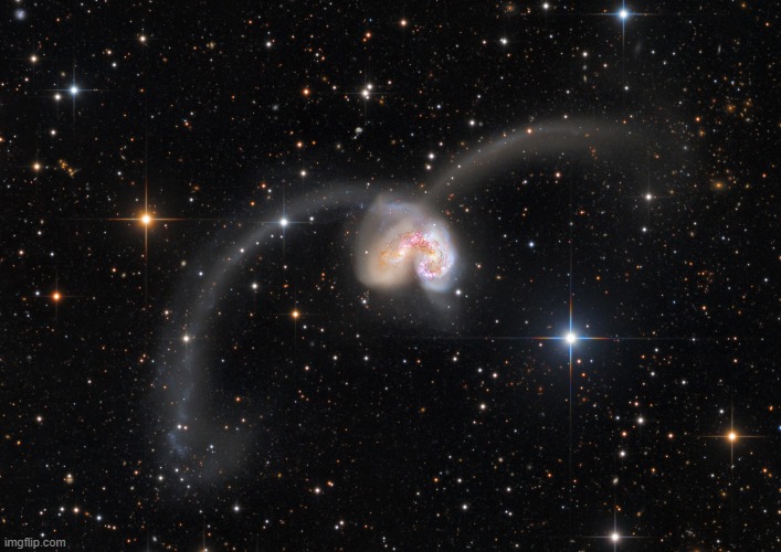 Explanation: Some 60 million light-years away in the southerly constellation Corvus, two large galaxies are colliding. Stars in the two galaxies, cataloged as NGC 4038 and NGC 4039, very rarely collide in the course of the ponderous cataclysm that lasts for hundreds of millions of years. But the galaxies' large clouds of molecular gas and dust often do, triggering furious episodes of star formation near the center of the cosmic wreckage. Spanning over 500 thousand light-years, this stunning view also reveals new star clusters and matter flung far from the scene of the accident by gravitational tidal forces. The remarkably sharp ground-based image, an accumulation of 88 hours of exposure captured during 2012-2021, follows the faint tidal tails and distant background galaxies in the field of view. The suggestive overall visual appearance of the extended arcing structures gives the galaxy pair, also known as Arp 244, its popular name - The Antennae.