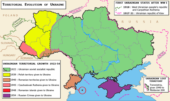 The territory of the Ukrainian state claimed by the government in Kyiv was assembled, not by Ukrainians themselves but by outsiders, and took its present form following the end of World War II. To think of it as a traditional or primordial whole is absurd. This applies a fortiori to the two most recent additions to Ukraine—that of some eastern portions of interwar Poland and Czechoslovakia, annexed by Stalin at the end of the war, and the largely Russian-speaking Crimea, which was transferred from the Russian Socialist Federated Soviet Republic (RSFSR) well after the war, when Nikita Khrushchev controlled the Communist Party of the Soviet Union.