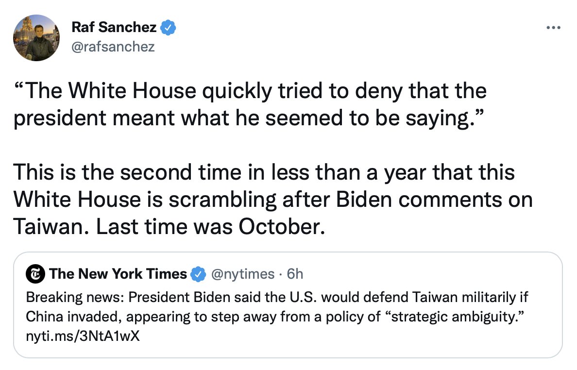 That’s a relief, and I was fairly certain they would. But this Big Bad Biden Blunder (or “gaffe”) followed by White House Walkback is beginning to play on a loop. Talk about your mixed signals during a period of international high tension and sabre rattling. Not to mention it highlights Biden’s cognitive, er, difficulties.