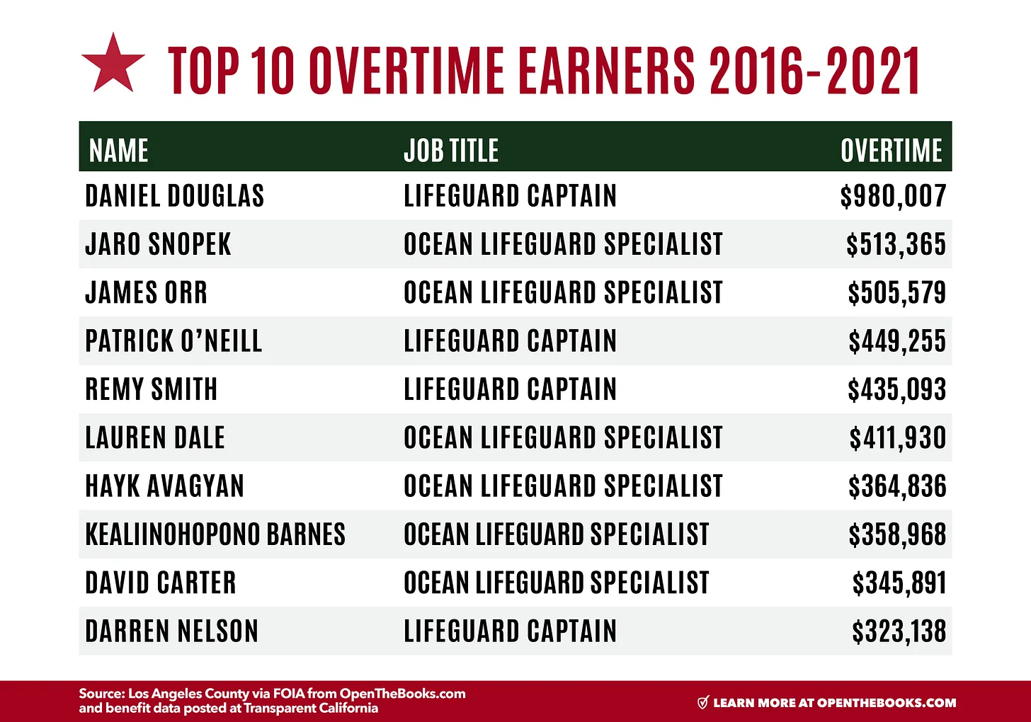 Our auditors at OpenTheBooks.com found 98 LA lifeguards earned at least $200,000 including benefits last year, and 20 made between $300,000 and $510,283. Thirty-seven lifeguards made between $50,000 and $247,000 in overtime alone.