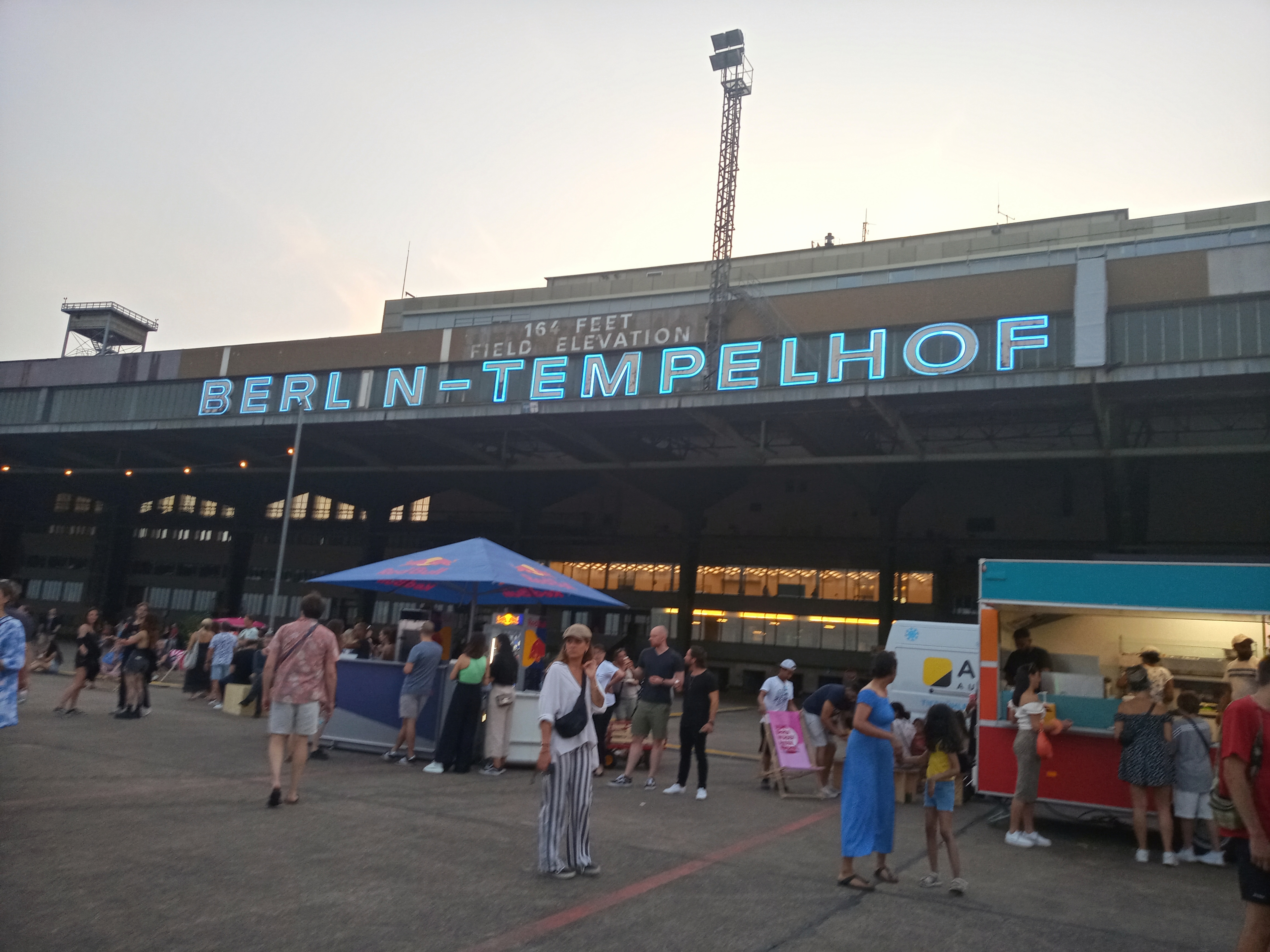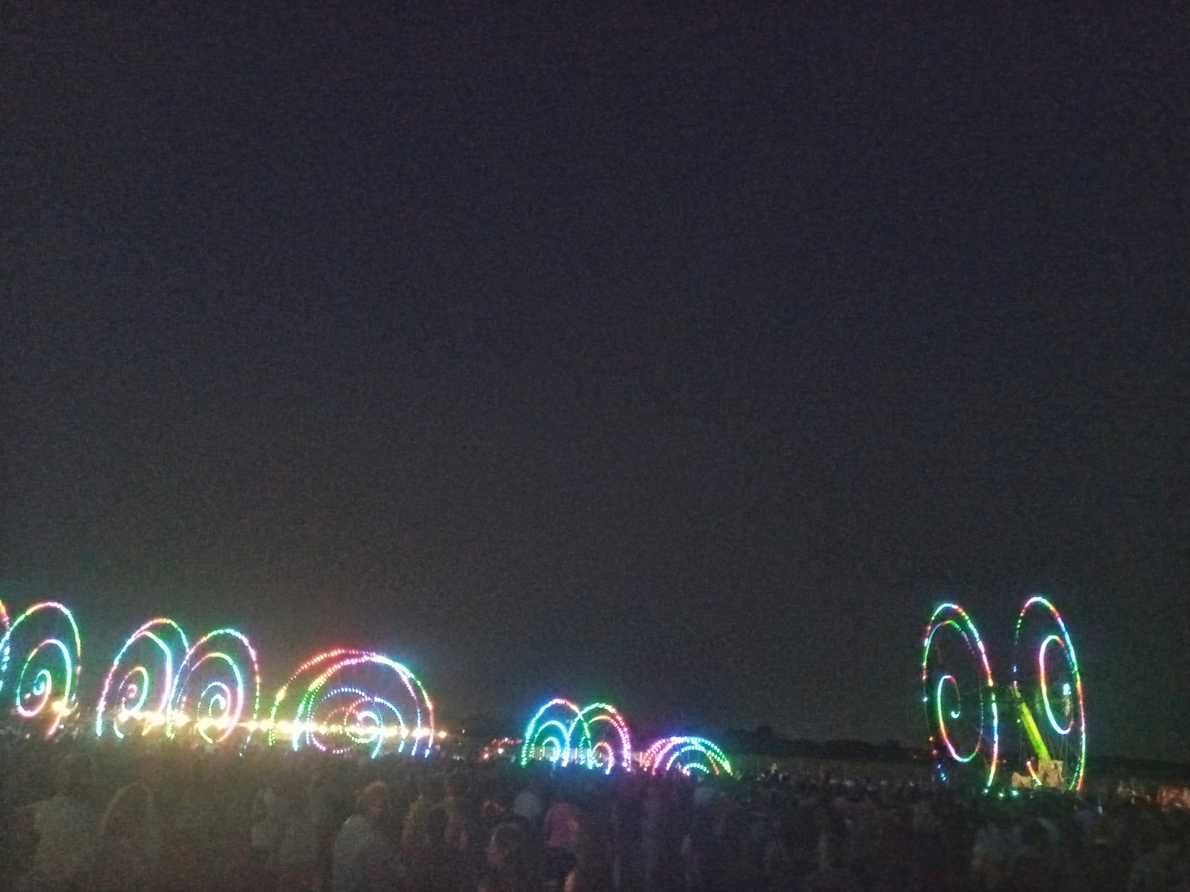 Started last night at Tempelhof Sportsfield (used to be the airport) with Compagnie Off a french performance group. They rolled out wheels with colored lights that looped around in the crowd. Then the Mother Wheel, which was already out on the grass, lit up. It raised a hundred feet into the air as the smaller wheels joined it. All that happened while club music was played on huge speakers. I didn't ride my bike there because my wife wanted to go - but she doesn't ride so we took the bus.