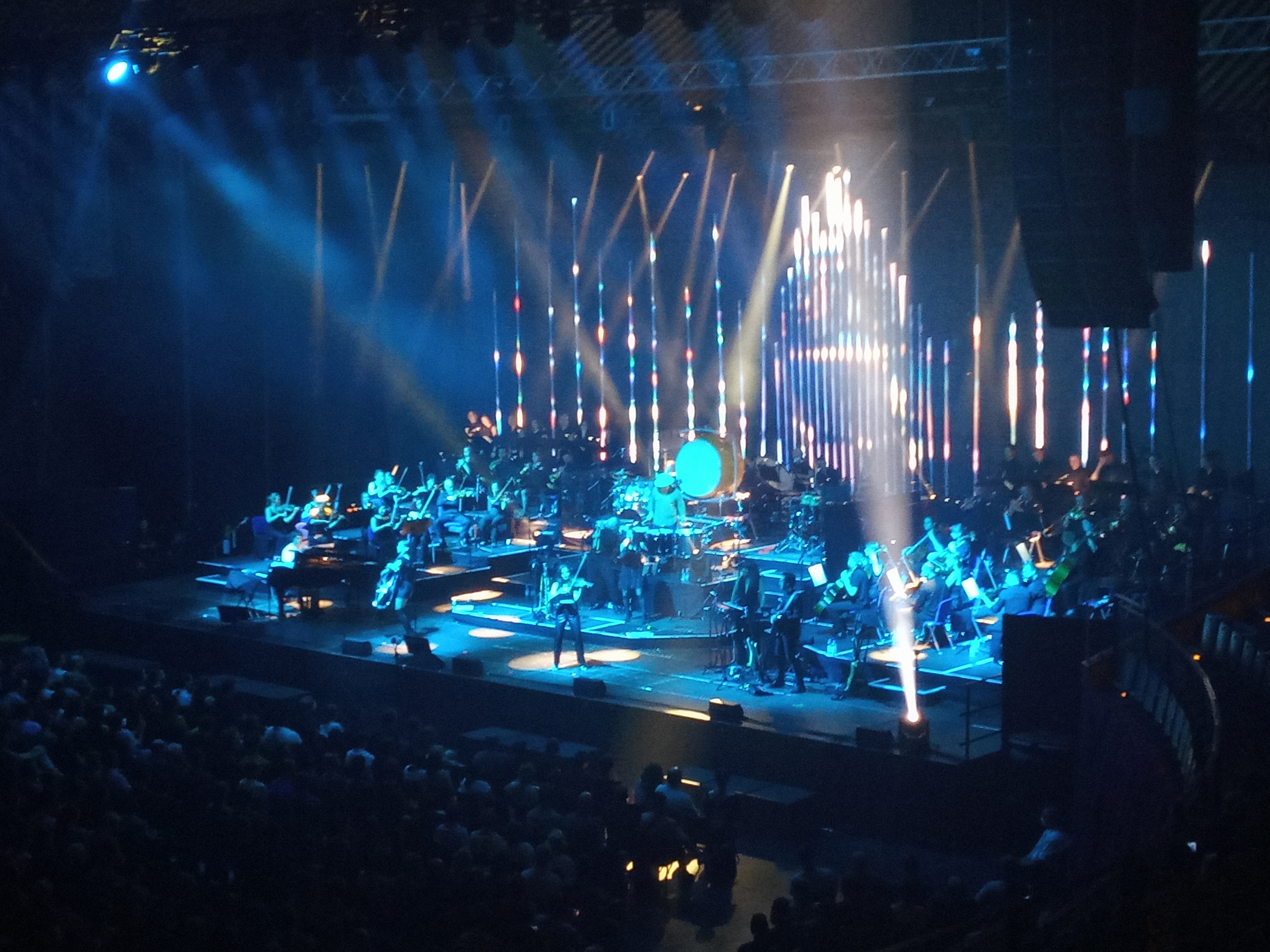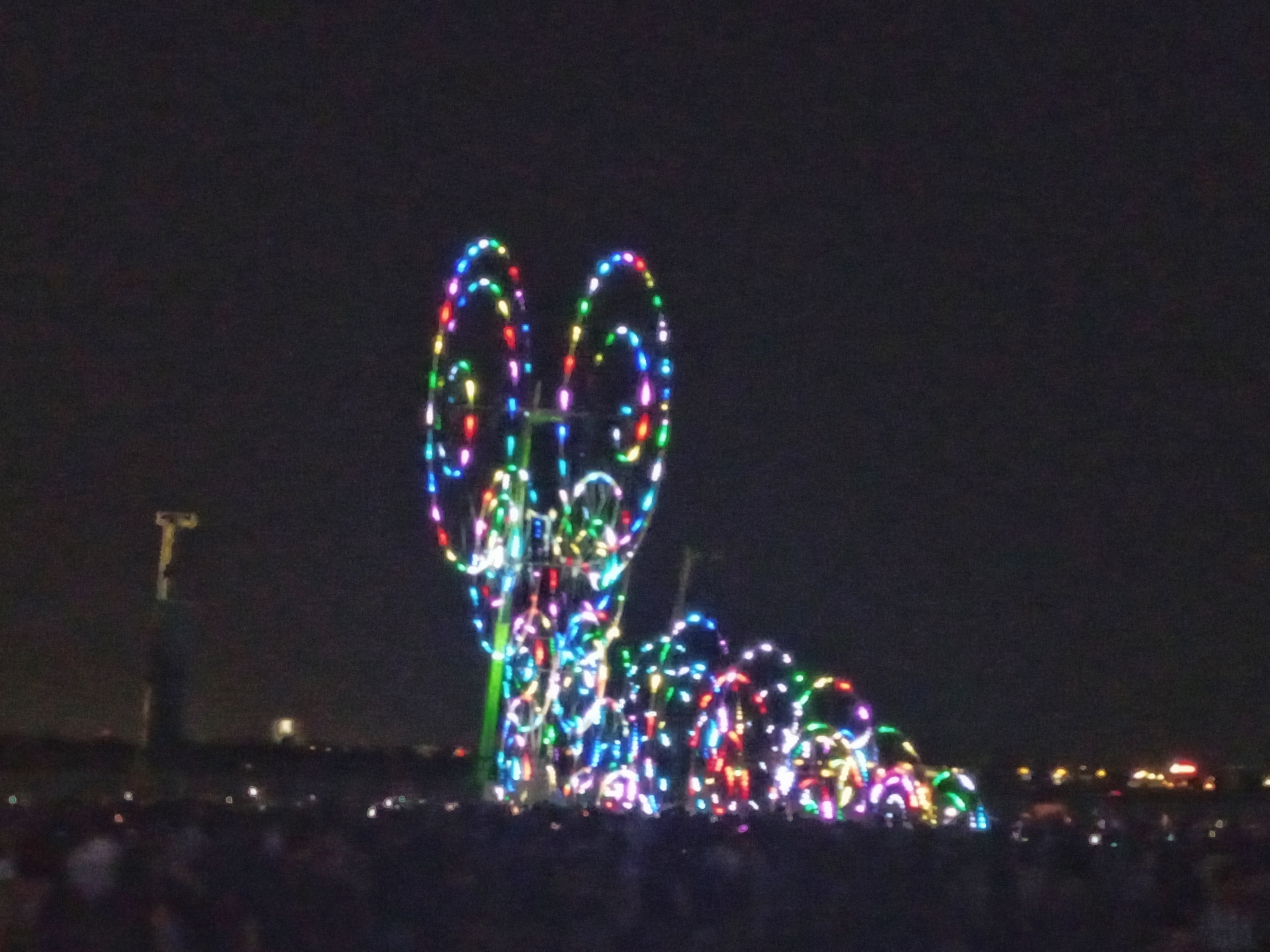I made a short video at the end of the Compagnie Off show. It is hard to see but there is a man up there holding a red flare. They were at the Burning Man show in America so the concept probably comes from that.