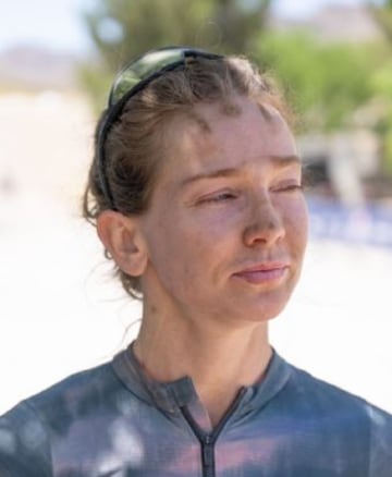 If you look carefully you’ll see her face is dirty, with mud on her nose, forehead, chin, upper lip, & cheeks, with only her eyes clear, probably from goggles or sunglasses; oh, and har neck is filthy, too.