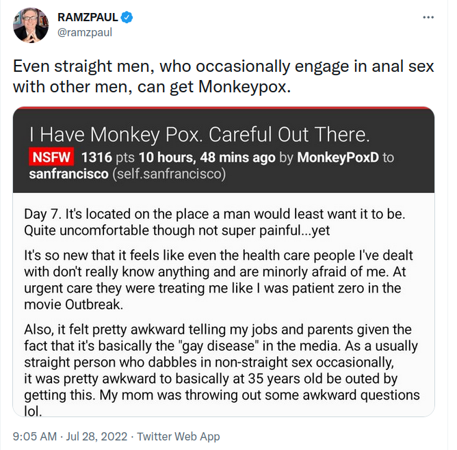 So stopping having promiscuous anonymous sex with male partners. It’s very simple. iDGAS about your self-inflicted monkeypox pain.
