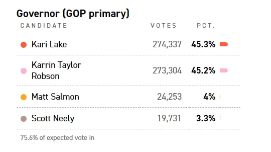 Breaking:@KariLake has just taken the lead over @Karrin4Arizona. pic.twitter.com/roflLGcFrU— Kari Lake War Room (@KariLakeWarRoom) August 3, 2022
