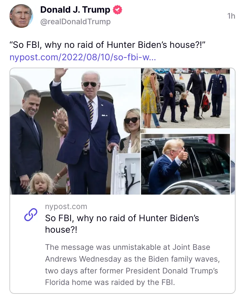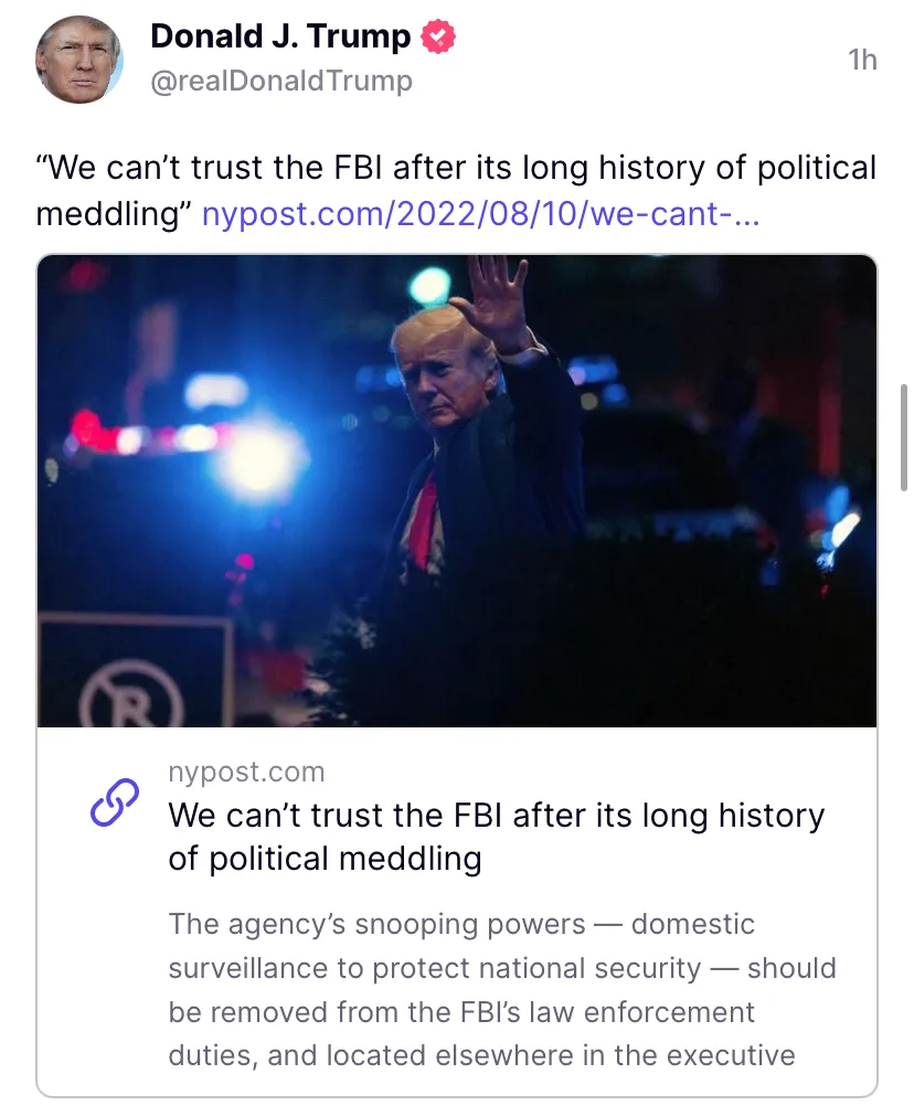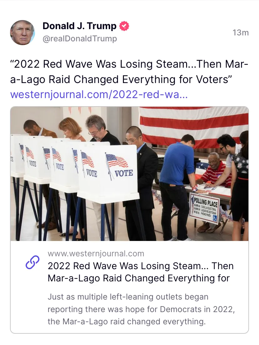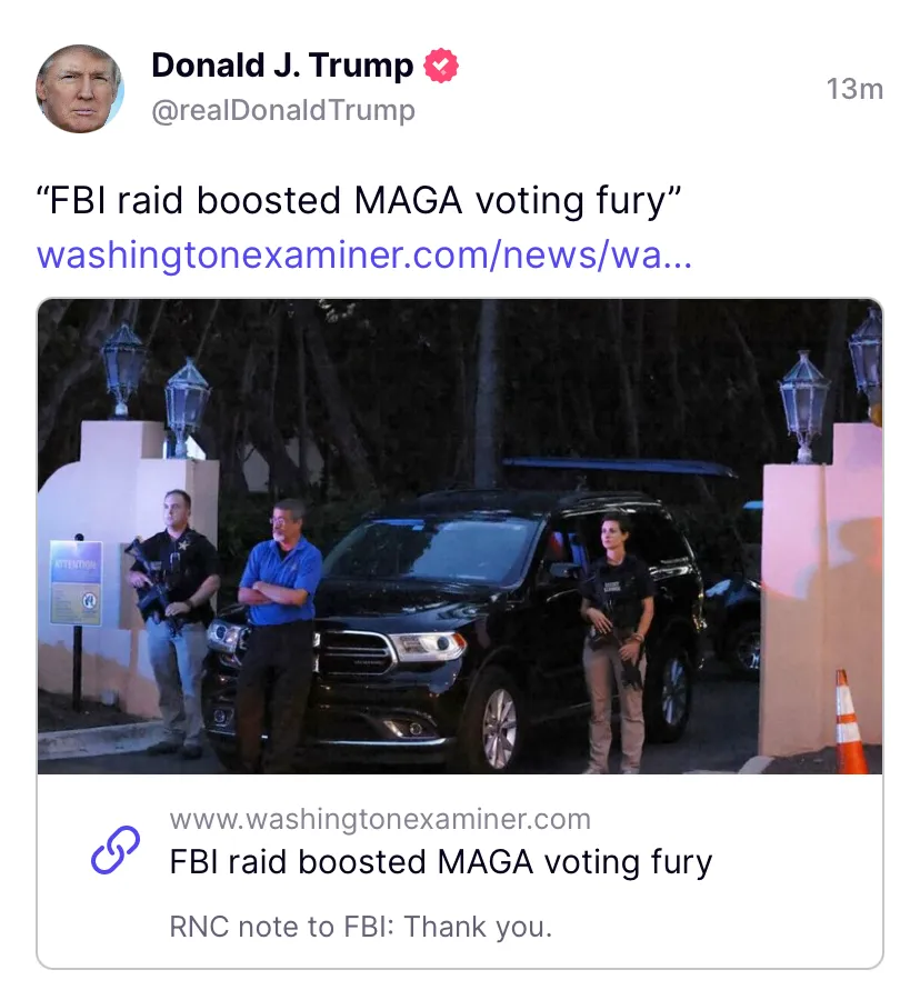 Trump took to Truth Social today to echo my sentiment with a series of truths with only one topic on the menu; the Mar-a-Lago raid, and how it has garnered support and energized an already highly motivated Trump base.