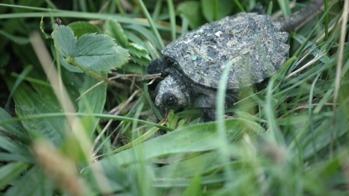 A Snapping Turtle Hatchling is making it’s way through high grass to it’s destination.