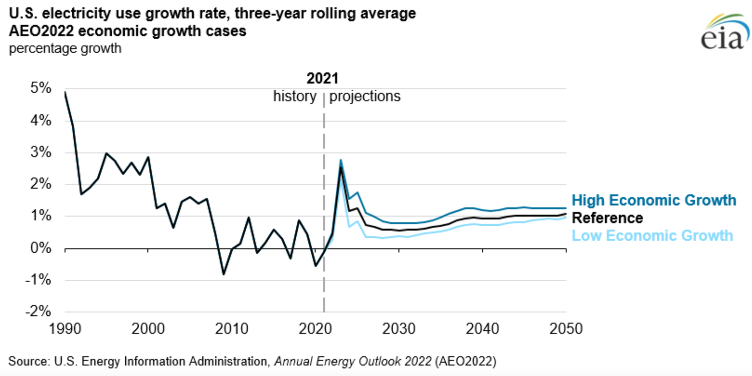 Are there any plans afoot for anything like that? Here’s another chart from EIA showing their projections of growth in U.S. electricity generation capacity out to 2050, from their 2022 Annual Energy Outlook: