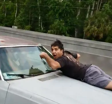 Shocking footage shows petrified man desperately hanging on to the hood of his car as it speeds down the motorway